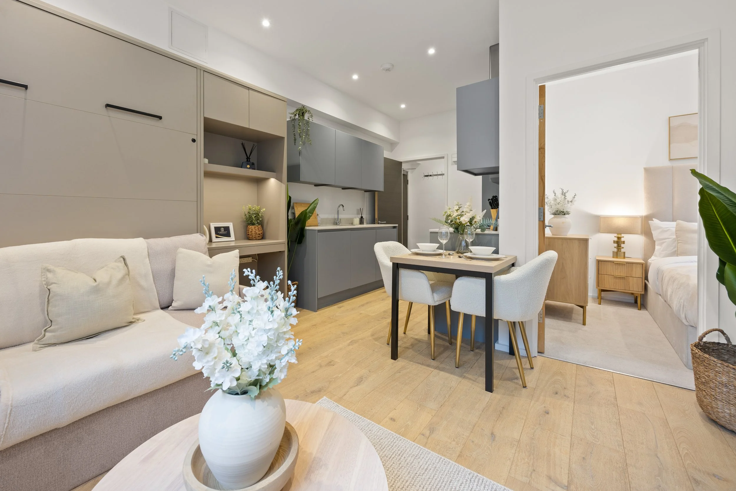 Each apartment features a comfortable bedroom with a luxury ottoman bed, along with a bright open-plan living area. A standout feature is the sleek, bespoke wall bed with a fully integrated custom sofa—allowing the space to transform effortlessly into either a relaxing living area or an additional double bedroom with a full-size mattress.